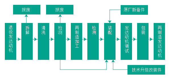 再制造對舊發(fā)動機完全拆解,拆解到單一零部件,并對所有零件進行分檢測量,而普通大修只對舊發(fā)動機的故障部位拆解,對隱含的質(zhì)量問題無法排除。
